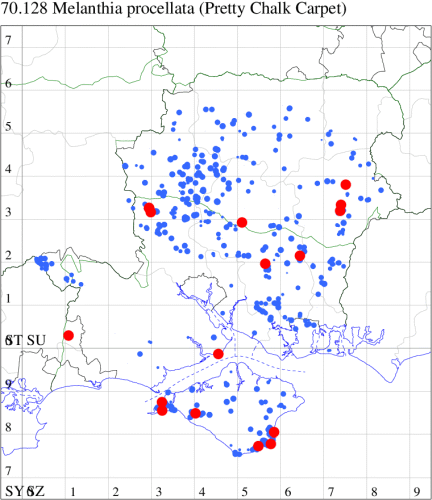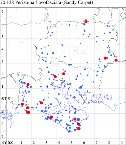 Local on calcareous grassland, sand-hills and coastal shingle throughout the British Isles, a species of conservation concern under the UK Biodiversity Action Plan. Local on good quality grassland, particularly on the downs, in Hampshire but quite rare in the Isle of Wight. Wingspan 20-26 mm. Paler than most Perizoma species, and lacking the two dark spots on the sub-terminal fascia of Twin-spot Carpet P. didymata. Larva feeds on seeds of Yellow-rattle, over-wintering as a pupa.