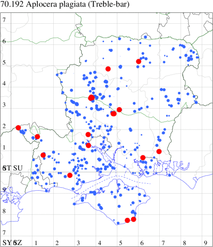 Common throughout much of southern Britain; widely distributed and fairly common in Hampshire and on the Isle of Wight: distribution of accepted records indicates that efformata is more likely in calcareous habitats than plagiata: the present species appears to be the more common on the Isle of Wight and in the New Forest but it is unclear whether this is a true reflection of status. Wingspan 37-43 mm. The main confusion species is Lesser Treble-bar A. efformata, but innermost fascia usually more sharply angled in that species. The most reliable separating characteristic on males is that plagiata has elongated, pointed claspers giving rise to a narrow abdomen tip: efformata has a blunter tip to the abdomen with rather shorter, curved claspers. Larva feeds on St John's-worts Hypericum sp.