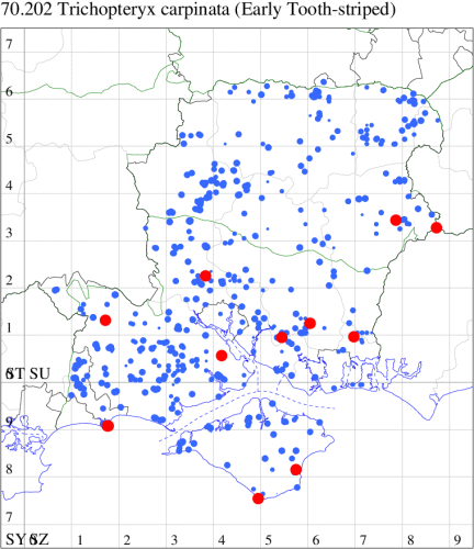 VC11: Frogham, one, 20 Mar (NTO); Romsey, two, 13 Mar (NRJ); Dibden Purlieu, one, 06 Apr (RAC); Botley Wood, four, 15 Mar (F.M.G.); Waterlooville, one, 07 Apr (DWhe); West Walk, seven, 08 Mar; three, 12 Apr (F.M.G.); Hengistbury Head, one, 05 Apr; two, 05 Apr; one, 05 Apr (MJef);
