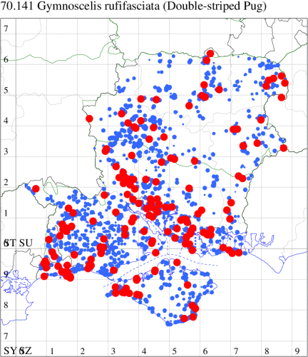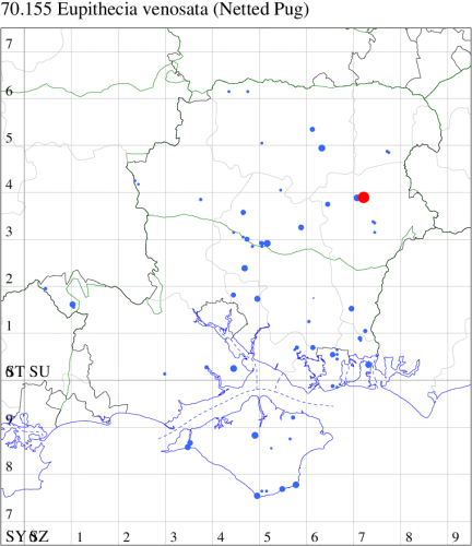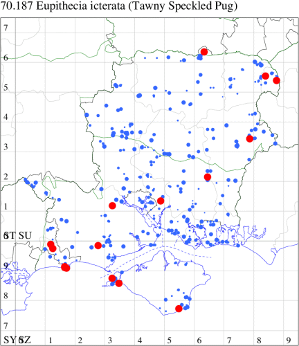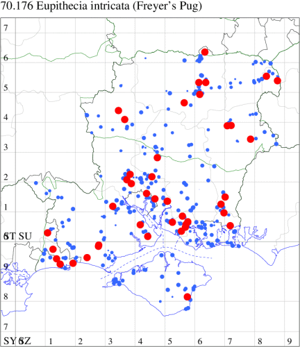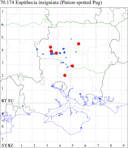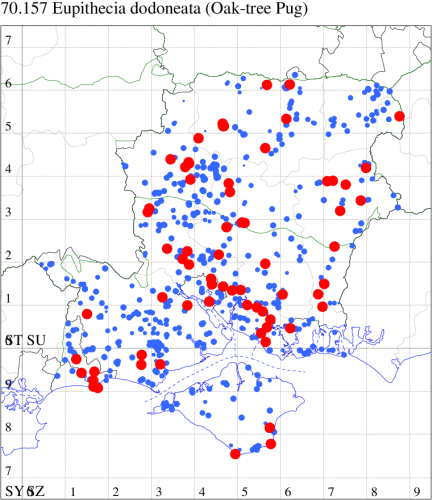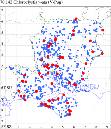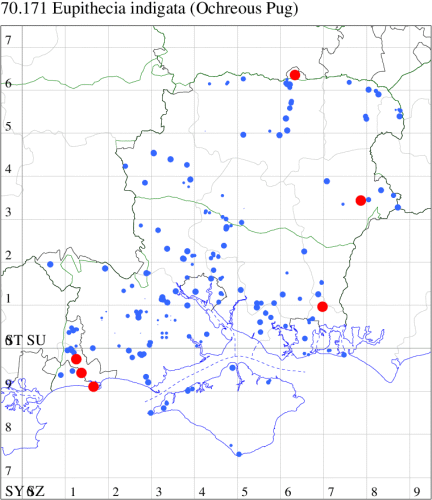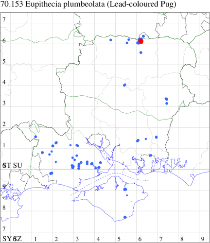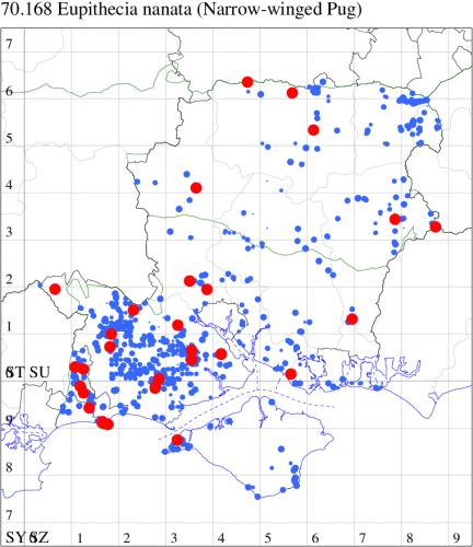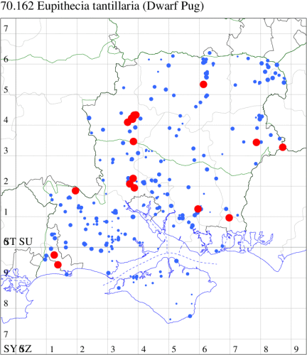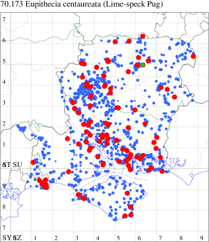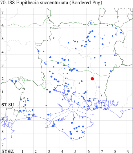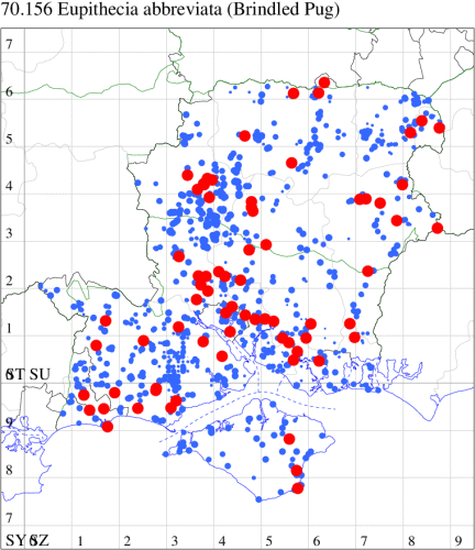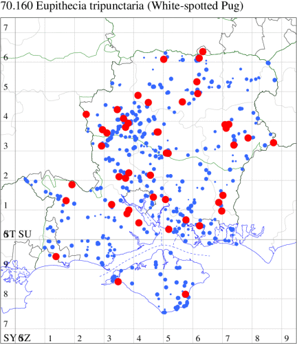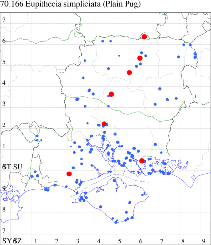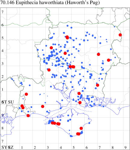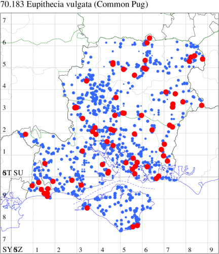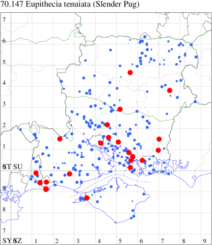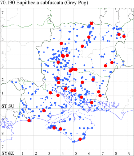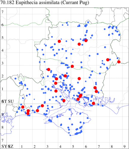 Common in gardens, allotments, hedgerows and open woodland throughout the British Isles. In Hampshire and on the Isle of Wight recorded in small numbers throughout, but easily overlooked. Wingspan 17-22 mm. The main confusion species is Wormwood Pug E. absinthiata, which is larger, with more distinct markings. Larva feeds on Hop, Black Currant and Red Currant, over-wintering as a pupa.