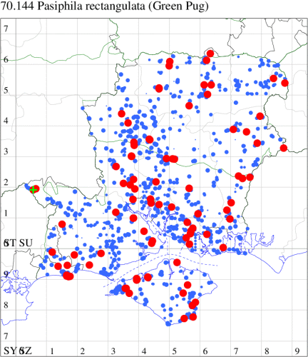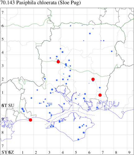 Common in mature hedgerows, scrub and woodland edges throughout much of England. In Hampshire larvae recorded in numbers from blackthorn in the past, but rather uncommon to light, mostly in the New Forest, and occasionally elsewhere in the county and on the Isle of Wight, where recorded in numbers in some years. Wingspan 17-19 mm. Similar to Green Pug P. rectangulata, but that species has postmedian line strongly toothed near costa, and Sloe Pug usually has salmon-pink (black in Green Pug) band at base of abdomen. Larva feeds on flowers of Blackthorn, over-wintering as an egg.