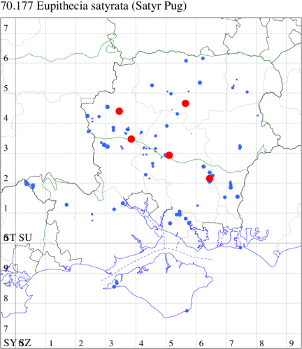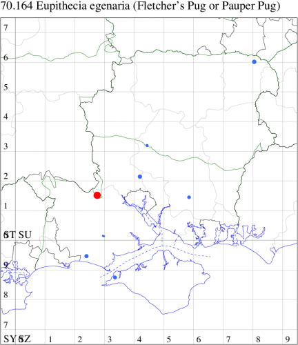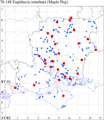 Local in woodland, hedgerows and scrub, particularly on calcareous ground throughout much of England, mostly in the south-east. In Hampshire and on the Isle of Wight rather uncommon, especially in the New Forest and on the Island. Wingspan 13-15 mm. The most likely confusion species is Slender Pug E. tenuiata, which see for differences. Larva feeds on flowers of Field Maple, over-wintering as an egg.