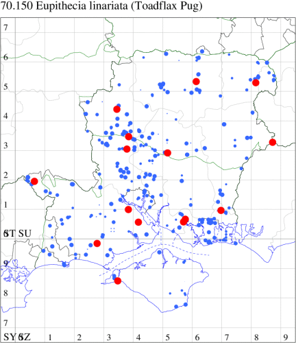 Common in calcareous grassland, rough ground and gardens throughout the British Isles; present in most of Hampshire, but distinctly uncommon on the Isle of Wight. Wingspan 16-20 mm. The main confusion species is Foxglove Pug E. pulchellata; in Foxglove Pug, the outer edge of the central cross-band is kinked at the costa, while in Toadflax Pug the central cross-band is gently curved at the costa. Larva feeds on Common Toadflax and Snapdragon, often in the capsules, over-wintering as a pupa.