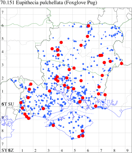 Common in woodland, calcareous grassland, embankments and waste ground throughout the British Isles. Widespread and common in Hampshire and on the Isle of Wight. Wingspan 18-22 mm. The main confusion species is Toadflax Pug E. linariata: in Foxglove Pug, the outer edge of the central cross-band is kinked at the costa, while in Toadflax Pug the central cross-band is gently curved at the costa. Larva feeds within flowers of Foxglove, over-wintering as a pupa.