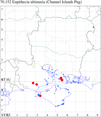 Recent colonist and immigrant in southern England and on the Channel Islands, predominantly coastal. In Hampshire this southern European species was first recorded by John Langmaid in his Southsea trap on 29 June 1995, with another on 30 July that year. Exactly a year later than that last sighting, larvae were discovered in good numbers on Tamarisk on Sinah Common, Hayling, and in 1997 the first adults were captured on the Isle of Wight. Since then, it has become somewhat frequent at light around the coast of the Isle of Wight and coastal Hampshire from Southampton to Hayling, but remains rare to the west of the Test. Larvae remain confined to Hayling on the mainland, but more widespread on Wight. In 2021, there was a surprising sighting on an individual to a light trap in the north-east of Hampshire. Wingspan 13-17 mm. The most likely confusion species is Thyme Pug E. distinctaria, but smaller and lacking the black fascia of Thyme Pug. Larva feeds on Tamarisk, over-wintering as a pupa.