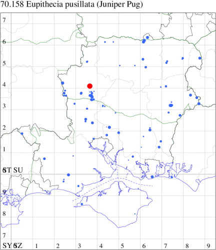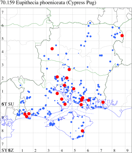 Common in gardens, parks and plantations throughout much of England. In Scotland subspecies millieraria, known proverbially as Edinburgh Pug, occurs on moorland. In Ireland subspecies hibernica, known as Mere's Pug, occurs on the limestone of the Burren. In Hampshire and on the Isle of Wight usually found in suburban localities, in association with leylandii, and can be fairly common. Wingspan 20-24 mm. A possible confusion species is Pimpinel Pug E. pimpinellata, which see for differences. Larva feeds on Juniper, Lawson's Cypress and Leyland Cypress, over-wintering as a pupa.