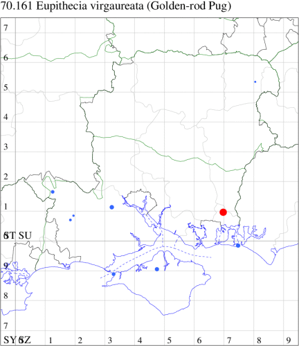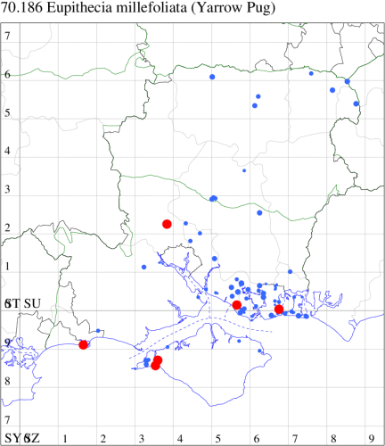 Nationally scarce (Nb) in waste ground, sand-dunes, shingle beaches, roadside verges and rough grassland, in south-eastern England, predominantly coastal. In Hampshire and on the Isle of Wight a fairly recent arrival, first recorded in 1951 and now well-established on waste ground near the sea in south-east Hampshire and re-discovered on the Isle of Wight in 1998. Wingspan 19-23 mm. The most likely confusion species is Grey Pug E. subfuscata, but Yarrow Pug has a less rounded forewing and is less uniformly grey. Larva feeds on flowers and seedheads of Yarrow, over-wintering as a pupa.