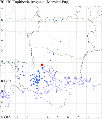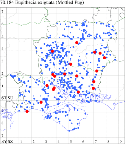 Common in woodland, scrub, hedgerows and gardens throughout England and Wales. Widespread and common in Hampshire and on the Isle of Wight. Wingspan 20-22 mm. The main confusion species is Brindled Pug E. abbreviata, which is often nearly over before the first Mottled Pug appears, and has less conspicuous discal spot and black wedges. Larva feeds on Hawthorn, Blackthorn and Dogwood, over-wintering as a pupa.