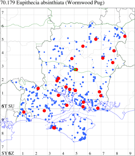Common in gardens, saltmarshes, woodland and grassland throughout much of the British Isles. In Hampshire and on the Isle of Wight fairly common to common on waste ground and in woods and large gardens. Wingspan 21-23 mm. The main confusion species is Currant Pug E. assimilata, but Wormwood Pug is larger, with more distinct markings. Larva feeds on Mugwort, Yarrow, Common Ragwort, Wormwood, Sea Aster, Goldenrod and Canadian Goldenrod, over-wintering as a pupa.