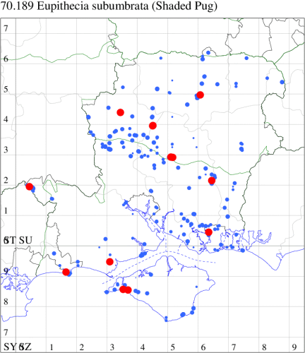 Common in a wide variety of habitats, from gardens, heathland and woodland, to downland and marshes throughout the British Isles. Widespread and common in Hampshire and on the Isle of Wight. Wingspan 17-21 mm. A large, grey pug with a small discal spot, one of the commonest species of Eupithecia, and familiarity with this species is the key to the identification of other, less common species; a unicolorous form is very similar to unicolorous forms of Green Pug Pasiphila rectangulata and several other pug species. Larva feeds on various woody plants, including Hawthorn and Blackthorn, and herbaceous plants, including Ragwort and Yarrow, over-wintering as a pupa.