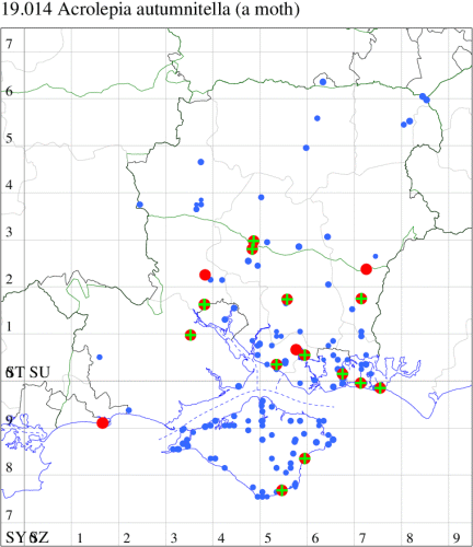 For the maps, all records prior to 2024 are shown by a blue dot (the larger the dot, the more recent), with the current year's records shown in red. As previous records are superimposed on any report for 2024, new sites have greater emphasis (i.e. will show as 'more red').