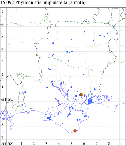 Local in fens, marshes, river-banks and other damp areas throughout southern England. In Hampshire known only from a handful of sites, including Fleet, Greywell Moors, Southsea and Leckford, but perhaps under-recorded. Not recorded from the Isle of Wight to date. Wingspan 6-7 mm. The imago can be separated from other Phyllocnistis only by dissection of the genitalia (females only, males are indistinguishable). Larva mines leaves of Purple Willow Salix purpurea. See the leafmines.co.uk newsletter that describes the mines of the four species in the complex.