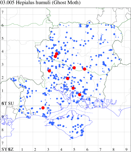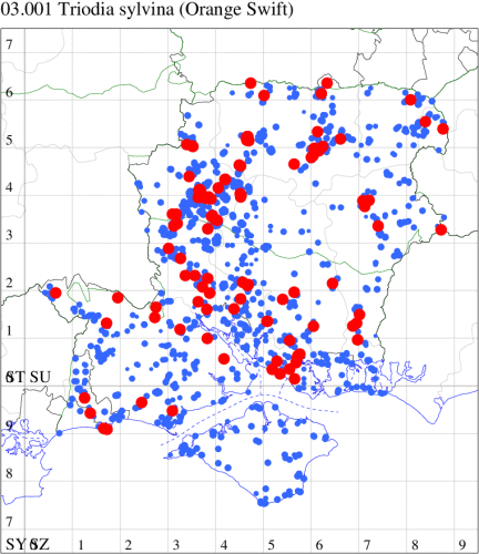 Common in rough meadows and grassland throughout much of Britain and Ireland, but excluding the Isles of Scilly, a species of conservation concern under the UK Biodiversity Action Plan. Widespread in Hampshire and on the Isle of Wight but local and declining. The males have leks in grassy places on downland and in meadows where they fly in numbers at dusk, and the females wander, presumably on egg-laying missions, and come occasionally to light. Wingspan male 44-46 mm, female 46-48 mm. Unmistakable. The larva is polyphagous in the root systems of many grasses and herbaceous plants such as Stinging Nettle and Hop, over-wintering twice.