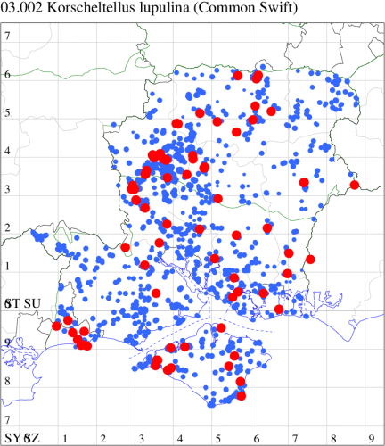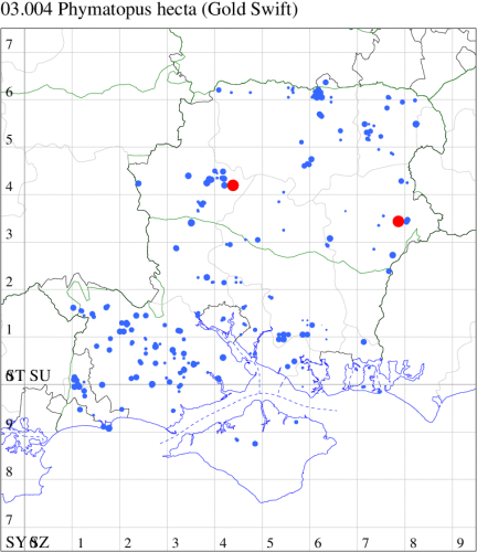 VC11: Earliest: East Tytherley, 27 Jul, 1 (GCE) Latest: Titchfield Haven NNR, 13 Sep, 1 (F.M.G.) Max count: Brownwich Cliffs, Titchfield, 16 Aug, 14 (F.M.G.)