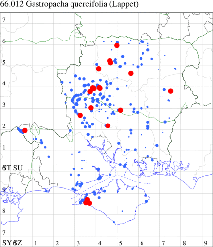 Common in hedgerows, scrub, downland, open woodland and gardens throughout southern England and south Wales, north to Cumbria. Widespread and fairly common in Hampshire and on the Isle of Wight. Wingspan 56-98 mm. One of the most remarkably camouflaged of all British moths. Larva feeds on Blackthorn and Hawthorn, and less frequently on Apple, Buckthorn and Alder Buckthorn.