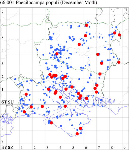 Common in woodland, scrub, hedgerows and gardens throughout much of the British Isles. In Hampshire and on the Isle of Wight widespread and common in wooded country in the three vice-counties, but doubtless still under-recorded because of the lateness of its flight period. Wingspan male 36-38 mm, female 42-48 mm. Unmistakable: no similar species fly so late in the year. Larva feeds on many deciduous tree species, including birch, oak, hawthorn and blackthorn.