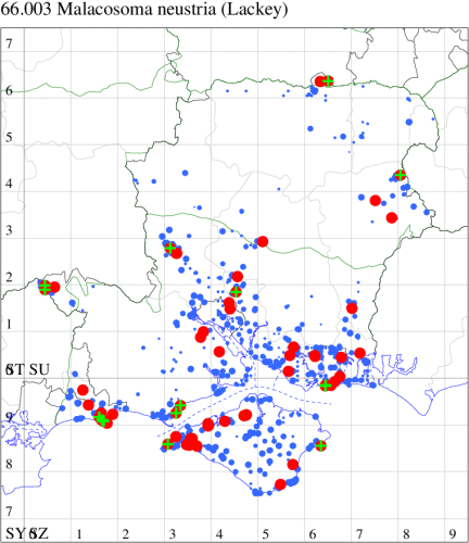 For the maps, all records prior to 2024 are shown by a blue dot (the larger the dot, the more recent), with the current year's records shown in red. As previous records are superimposed on any report for 2024, new sites have greater emphasis (i.e. will show as 'more red').