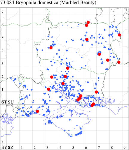 Formerly a primary migrant from mainland Europe, which occasionally arrived in sufficient numbers to temporarily establish: in the 21st century, now an increasingly common resident and found inland across southern Britain. In Hampshire and on the Isle of Wight first recorded in modern times in 1991, after which a scarce immigrant predominantly on the Isle of Wight; since 2008 has become increasingly common as a presumed resident species in the south-east of Hampshire and widespread across both counties. Quite variable but unlikely to be confused with any other species. Wingspan 24-30 mm. Larva feeds on various lichens.