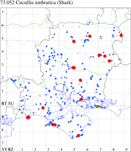 Common in rough ground, chalk and limestone grassland, sand-dunes, shingle beaches and gardens throughout the British Isles. In Hampshire and on the Isle of Wight this species is still fairly frequent in places, especially near the coast. Wingspan 48-57 mm. The only confusion species is Chamomile Shark C. chamomillae, but C. umbratica has forewing fringes clear and unmarked, while on C. chamomillae they are cut by dark veins. Larva feeds on flowers and leaves of Beaked, Marsh, Rough and Smooth Hawk's-beard, Mouse-ear Hawkweed and Perennial Sow-thistle, over-wintering as a pupa.