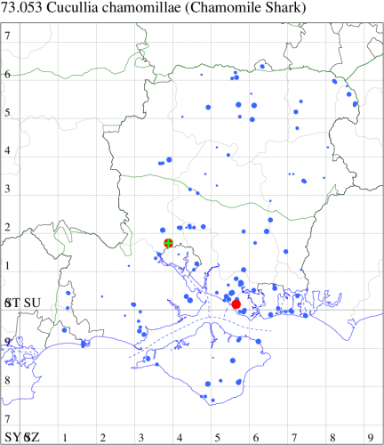 Local on calcareous grassland, waste ground, farmland and gardens; well distributed, showing a preference for sandy or light calcareous soils, and probably most common near the coasts, in England and Wales, Scotland to Perthshire, and Ireland (MBGBI Vol 10). In Hampshire and on the Isle of Wight thinly scattered through the three vice-counties, but scarcer than formerly, probably on account of changed agricultural techniques. Wingspan 42-52 mm. The most likely confusion species is Shark Cucullia umbratica, which see for differences. Larva feeds on flowers of Scentless Mayweed, Corn Chamomile, Stinking Chamomile and Feverfew, over-wintering as a pupa.