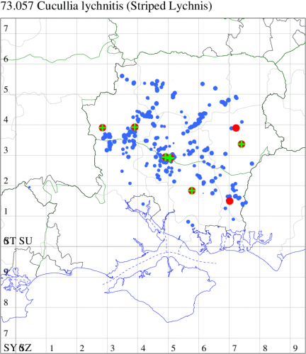 Nationally scarce (Na) and a priority species under the UK Biodiversity Action Plan, on calcareous grassland and roadside verges. Found throughout much of the chalk outcrop of central Hampshire, extending from the South Downs of West Sussex virtually to the border with Wiltshire. It is also breeding in Oxfordshire, Berkshire and in small scattered sites over a wide area in south Buckinghamshire. Hampshire is an important national stronghold for the species, and in 2000 the moth was discovered to have colonised the recently re-seeded extension of the Magdalen Hill Down Reserve near Winchester. Not recorded from the Isle of Wight to date. Wingspan 42-46 mm. The most likely confusion species are Mullein S. verbasci, which is usually larger and brown-tinged, with a clearly defined discal spot on the underside of the hindwing, whereas Striped Lychnis is grey-tinged and does not hindwing underside dot, and Water Betony S. scrophulariae, from which reliably separable only by reference to the genitalia. Larva feeds on flowers of Dark Mullein, over-wintering as a pupa.