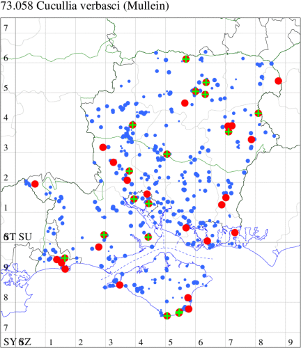 Common in calcareous grassland, woodland clearings, woodland rides, scrub, roadside verges, shingle beaches, parks and gardens throughout much of England and Wales, mostly in the south. In Hampshire and on the Isle of Wight well-distributed, partly as a result of the differing ecology of the two main food-plants. Wingspan 44-56 mm. The main confusion species are Striped Lychnis S. lychnitis and Water Betony S. scrophulariae. The larva is found on various species of mullein (Verbascum), in particular Great Mullein, but it also uses Buddleia in gardens, and not infrequently on figwort (Scrophularia sp.)