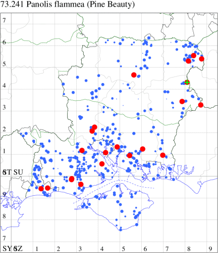 Common in coniferous and mixed woodland, plantations, parks and gardens throughout the British Isles. Widespread and fairly common in Hampshire and on the Isle of Wight. Wingspan 32-40 mm. Unmistakable. Larva feeds on needles of Scots, Corsican, Lodgepole and Maritime Pine.