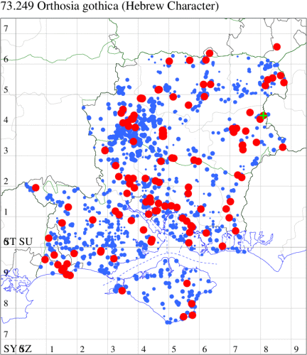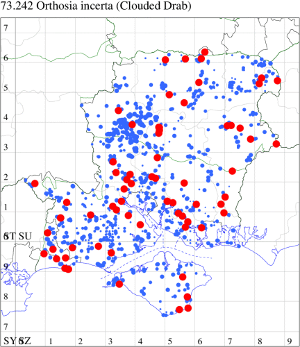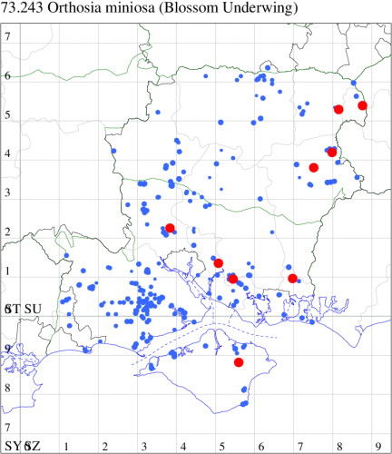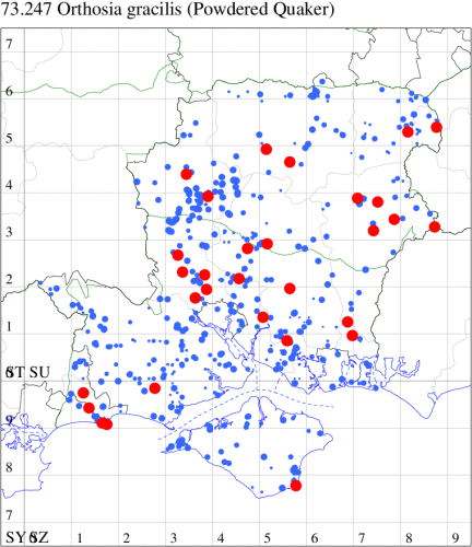Common in marshes, damp woodland and gardens throughout the British Isles, a species of conservation concern under the UK Biodiversity Action Plan. Widespread and still fairly common in Hampshire and on the Isle of Wight. Wingspan 35-42 mm. The main confusion species is Common Quaker O. cerasi, but the grainy, or powdered, appearance of O. gracilis is usually distinctive, and the innermost half of the reniform stigma is usually darker than the outermost half. Larva feeds on various woody and herbaceous plants, including Eared, Grey and Goat Willow, Black Poplar, Blackthorn, Bog-myrtle, Meadowsweet, Purple Loosestrife and Common Fleabane, over-wintering as a pupa.