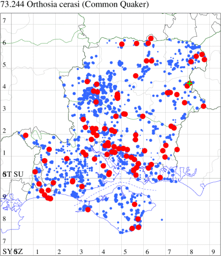 Local in oak woodland and mature hedgerows throughout much of southern England and Wales, north to Cumbria, also appearing as a migrant in the south. In Hampshire and on the Isle of Wight reported from scattered localities, and can be locally fairly common, for example in the New Forest, with some records relating to immigration. Wingspan 32-38 mm. The main confusion species, Common Quaker O. cerasi, has subterminal line complete and pale; upper stigmata clearly outlined whitish; median fascia, when present, narrow and dark; hindwing fuscous (MBGBI Vol 9). Larva feeds on Sessile Oak and Pedunculate Oak; also polyphagous on various herbaceous plants, over-wintering as a pupa.