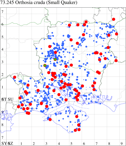 Common in broad-leaved woodland, areas with scattered trees and heathland throughout the British Isles. Widespread and extremely common in Hampshire and on the Isle of Wight, especially during warm dry springs. Wingspan 28-32 mm. A very common early spring visitor to light traps, where the small size and relatively small orbicular stigma easily distinguishes O. cruda from the equally common Common Quaker O. cerasi, and less frequent Blossom Underwing O. miniosa. Larva feeds on Pedunculate and Sessile Oak, Downy Birch, Hazel, Sallow and Field Maple.