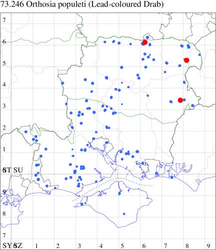 Local in broad-leaved woodland, parks and gardens throughout the British Isles; widely distributed across Hampshire and the Isle of Wight, occasionally in good numbers. Wingspan 34-40 mm. The main confusion species is the highly variable Clouded Drab O. incerta, but Lead-coloured Drab has more rounded forewing and more distinct black dots on subterminal fascia, and is less variable and usually always predominately grey. Larva feeds within catkins of Aspen and Black Poplar, subsequently feeding on the leaves, over-wintering as a pupa.