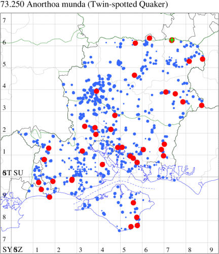 Common often abundant, in a wide range of low-land habitats, including woodland and gardens throughout the British Isles. Widespread and common in Hampshire and on the Isle of Wight. Wingspan 34-40 mm. A very common early spring visitor to light traps, distinguished from the equally common Small Quaker O. cruda by the relatively large size and large orbicular stigma; and from Blossom Underwing O. miniosa by its complete and pale, upper stigmata clearly outlined whitish, median fascia, when present, narrow and dark, and hindwing fuscous (MBGBI Vol 9). Larva feeds on various herbaceous trees and shrubs, including Oak, Sallow, Birch, Elm, Hawthorn and Hazel, over-wintering as a pupa.