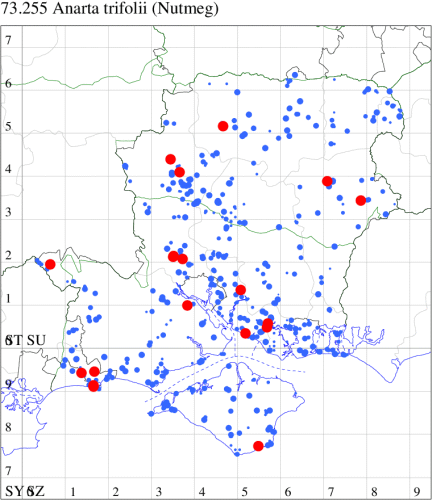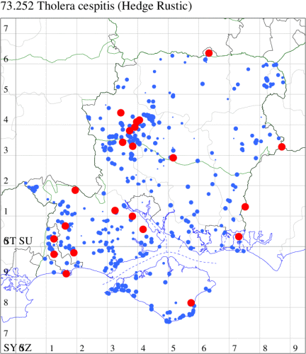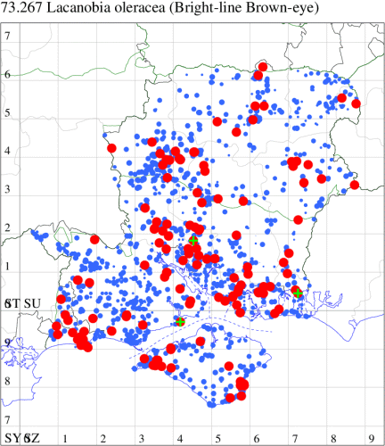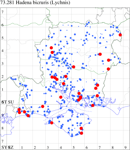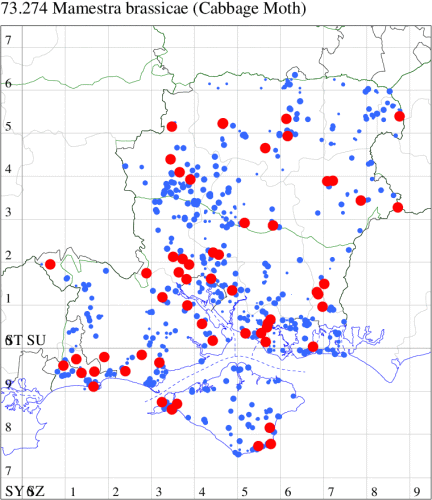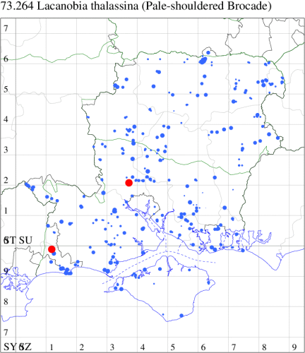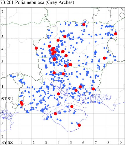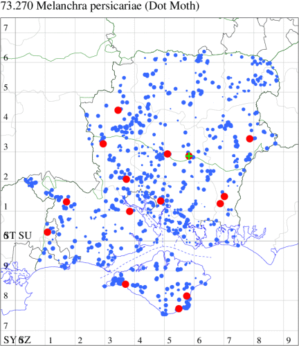 VC11: Woodlands, NF, one, 30 Jun (RBW); Lee, one, 15 Jun (CTha); East Tytherley, one, 07 Jun (GCE); Romsey, one, 03 Jun; one, 16 Jul (MJB); Swaythling, Southampton, one, 19 Jul (MEdg); Allbrook, one, 26 Jun; two, 27 Jun (SIng); Funtley, one, 22 Jun; one, 25 Jun (TDC); Portsmouth, one, 24 Oct (IRT); Lovedean, one, 27 May; one, 04 Jun; one, 16 Jun; one, 17 Jun; one, 22 Jun (ARJa); Christchurch: Cross Way, one, 01 Jul (LPyk); Hengistbury Head NNR, one, 02 Jun; one, 03 Jun; one, 06 Jun (RPH); two, 09 Jun (HengistH det. MJef); one, 24 Jun; one, 25 Jun (RPH); one, 27 Jun (MoTay det. MJef); one, 14 Jul (BKin det. MJef); Sway, one, 10 Jul (SKee);