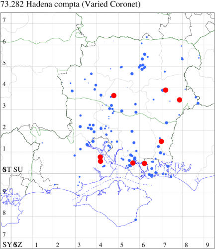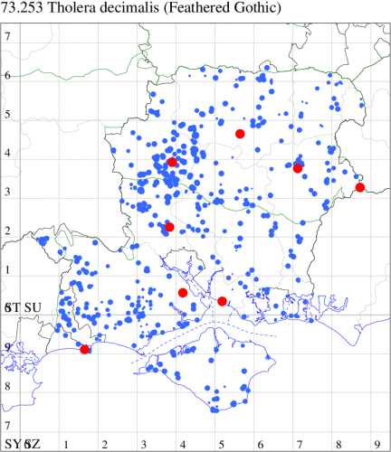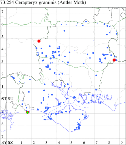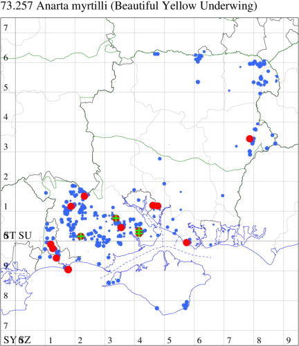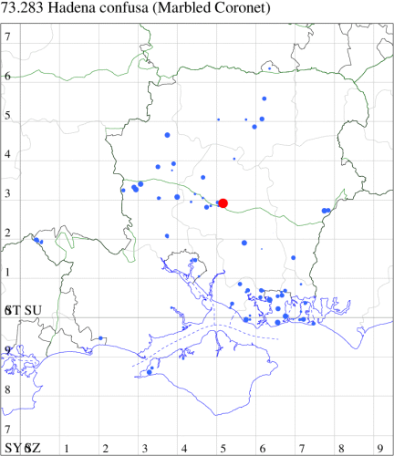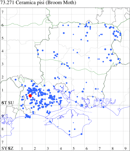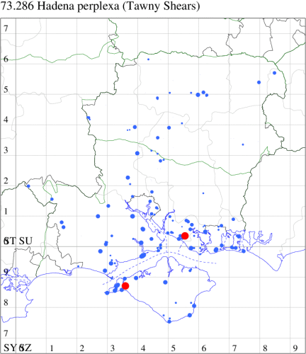 VC11: Avon Heath Country Park, two, 27 Aug (CDaw); North Poulner, Ringwood, present, 04 Sep (ASho); Hale Purlieu, NF, present, , 26 Aug (JPuz); Marchwood, one, 24 Aug; one, 01 Sep (CTha); Woodlands, NF, one, 02 Sep (RBW); Stockbridge Down NT, one, 28 Aug; Little Somborne, one, 09 Aug (GCE); Dibden Purlieu, one, 25 Aug; Dibden Purlieu, NF, one, 26 Aug; one, 27 Aug; two, 27 Aug; Dibden Purlieu, one, 28 Aug; one, 28 Aug; Dibden Purlieu, NF, three, 29 Aug; Dibden Purlieu, three, 30 Aug; Dibden Purlieu, NF, four, 31 Aug; two, 31 Aug; four, 01 Sep; five, 02 Sep; three, 03 Sep; three, 04 Sep; one, 04 Sep; one, 06 Sep; one, 07 Sep; two, 08 Sep (RAC); Northney, Hayling Island, present, 08 Sep (JWP); South Holt Farm, NF, two, 28 Aug (CGree det. OHen); Hurn, one, 01 Sep (MJef); Hengistbury Head NNR, one, 14 Aug (RPH); two, 26 Aug; one, 27 Aug (HengistH det. MJef); one, 29 Aug (MJef); one, 11 Sep (HengistH det. MJef); St Georges Drive, Bransgore, one, to lighted window, 02 Sep; one, 15 Sep (SPMC);