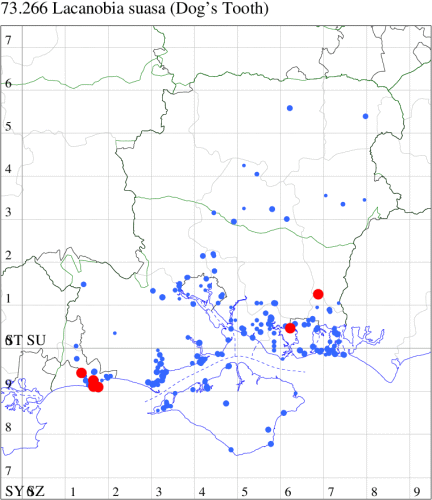 For the maps, all records prior to 2024 are shown by a blue dot (the larger the dot, the more recent), with the current year's records shown in red. As previous records are superimposed on any report for 2024, new sites have greater emphasis (i.e. will show as 'more red').