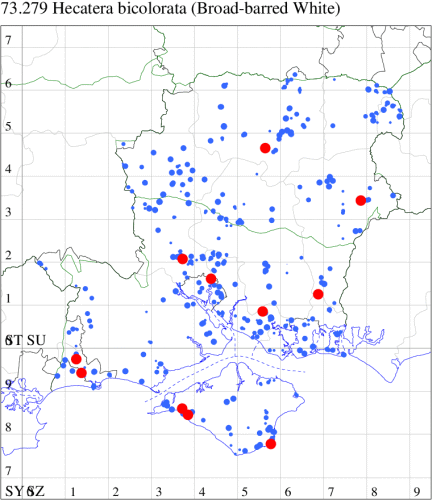 VC11: Marchwood, one, 02 Aug; Lee, one, 03 Aug (CTha); Fishlake Meadows, three, 12 Aug (NRJ); Romsey, one, 04 Aug; one, 11 Aug (MJB); Allbrook, one, 11 Jul (SIng); Brownwich Cliffs, Titchfield, six, 26 Jul; four, 16 Aug; one, 06 Sep (F.M.G.); Stubbington, one, 17 Jul (DPH); Fareham, one, 14 Aug (ADT); Merritown Heath, one, 29 Jun (DFoo); Hurn, one, 31 Jul (MJef); Hengistbury Head NNR, one, 10 Jul; one, 16 Jul (HengistH det. MJef); three, 23 Jul (BKin det. MJef); one, 07 Aug (HengistH det. MJef); four, 11 Aug; two, 12 Aug (MoTay det. MJef); one, 14 Aug (RPH); Hengistbury Head, 16, 30 Jul; Stanpit Marsh LNR, 12, 13 Aug (MJef); Burton, nr Christchurch, one, 02 Aug (JStw); Stanpit Marsh LNR, one, 13 Aug (RPH); Hengistbury Head, one, 27 Aug (MJef); Browndown, five, 09 Aug (F.M.G.);