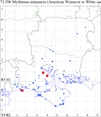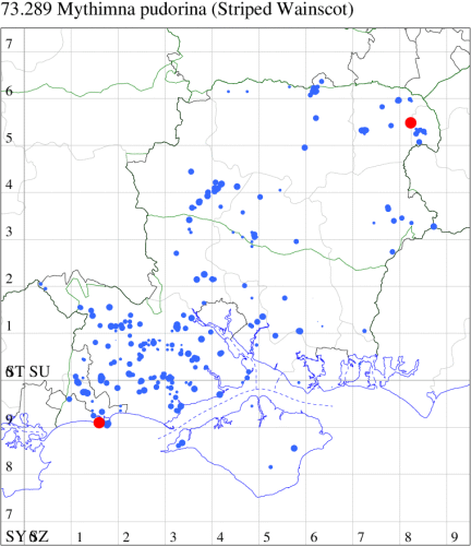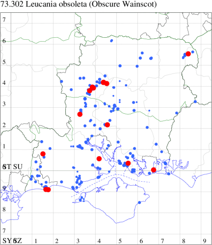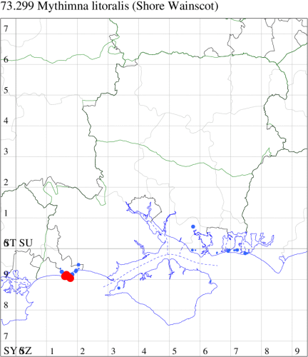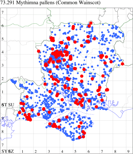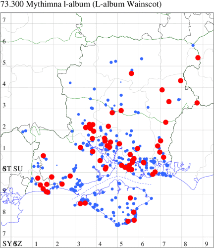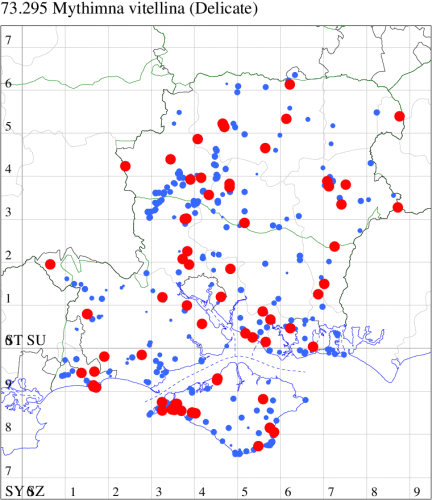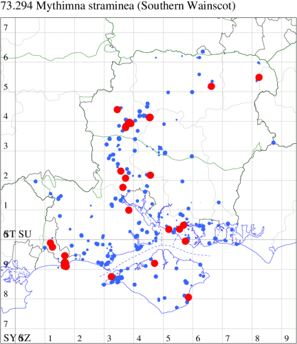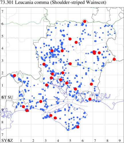 In the 20th Century, this species was a common immigrant from northern Europe, in many years arriving in southern England in sufficient numbers to breed. This century saw an increase and it continues to extend its range northwards, probably in response to climate change. In Hampshire and on the Isle of Wight, similarly it was once a scarce migrant which is now established and quite common along the south coast of Hampshire and throughout the Isle of Wight, and increasingly further inland, although still relatively scarce in VC12. Wingspan 34-40 mm. A relatively well-marked and distinctive wainscot. Larva feeds on Marram-grass, and away from coastal habitats, on other grass species.