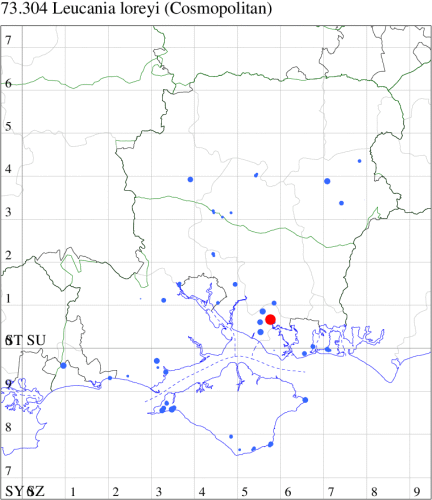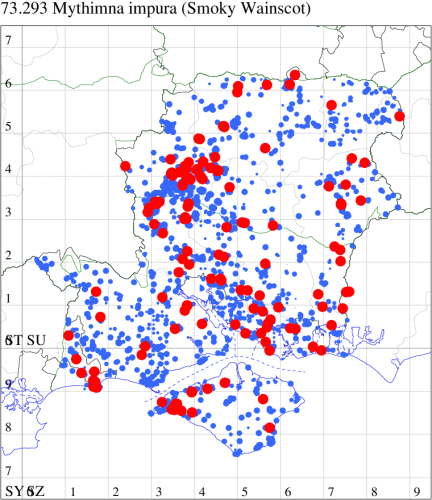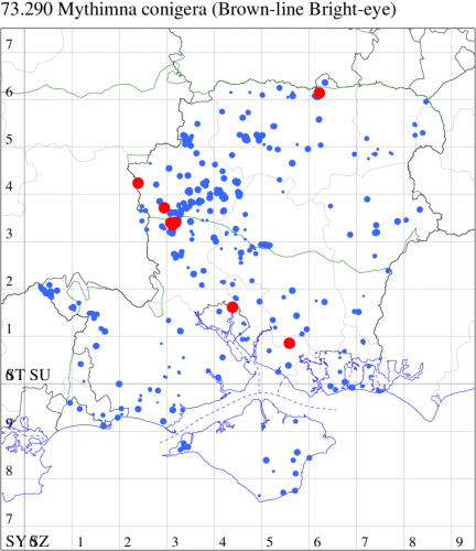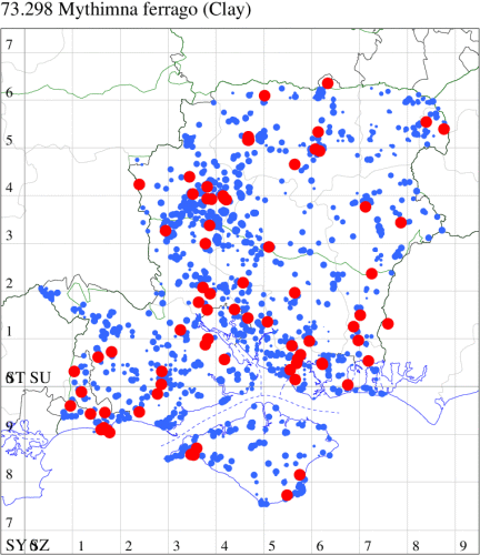 Common immigrant from northern Europe, appearing in southern England, and in recent years an increasingly common resident which continues to extend its range northwards, probably as a result of the increase in temperatures in the region. In Hampshire and on the Isle of Wight most common on the coast, but frequently encountered across the region. Wingspan 34-38 mm. The most likely confusion species is Clay Mythimna ferrago, which is usually larger, has the reniform spot less rounded and the subterminal fascia clearly dotted (MBGBI Vol 9). Larva feeds on Common Couch, Cock's-foot and various grasses.