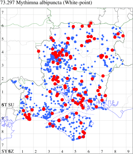 Fairly common immigrant from northern Europe, appearing in south-western England, in some years arriving in sufficient numbers to breed. Has increased over the course of the last fifteen years and continues to extend its range north-eastwards, probably as a result of the increase in temperatures in the region. In Hampshire and on the Isle of Wight infrequent along the coast, with a scattering of records inland. Wingspan 34-44 mm. There is a diagnostic clear white point in the reniform stigma, mid way along the dark streak which runs from base of wing three-quarters of the way to the termen. Larva feeds on various grasses, including Cock's-foot, unable to over-winter in significant numbers.