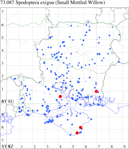 Common in grassland, farmland and gardens throughout the British Isles. Widespread and common in Hampshire and on the Isle of Wight. Wingspan 24-32 mm. Very variable in size, but easy to recognise by the series of four small dots along the costa of each forewing, the first, at about one quarter distance from the base of the wing, often the least obvious; one of a number of superficially similar, fairly nondescript moths, which are often difficult for beginners, Pale Mottled Willow is relatively common from spring to autumn, while Small Mottled Willow Spodoptera exigua and Dark Mottled Willow S. cilium are both migrants, and differ in the way in which they hold their wings at rest. Larva feeds on seeds of various grasses and cereal crops.