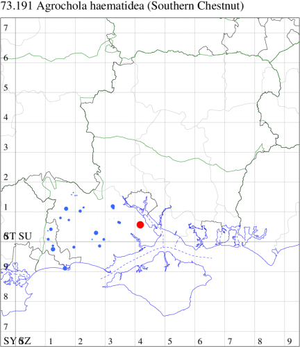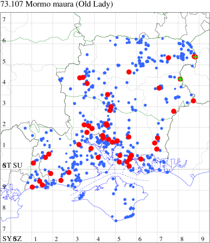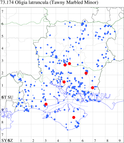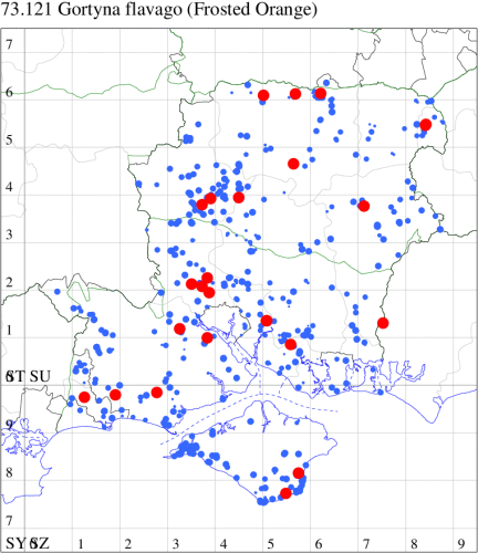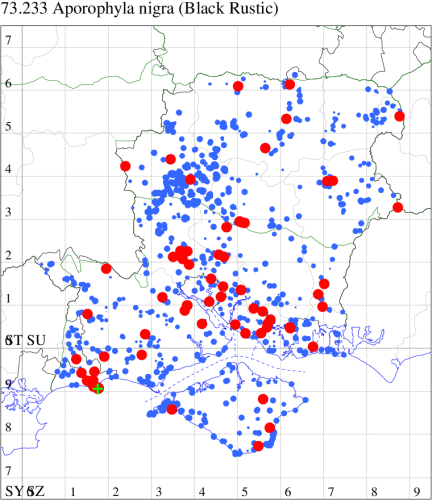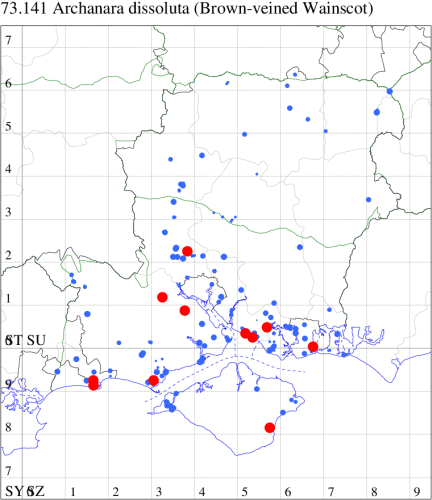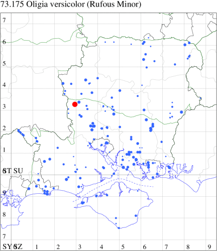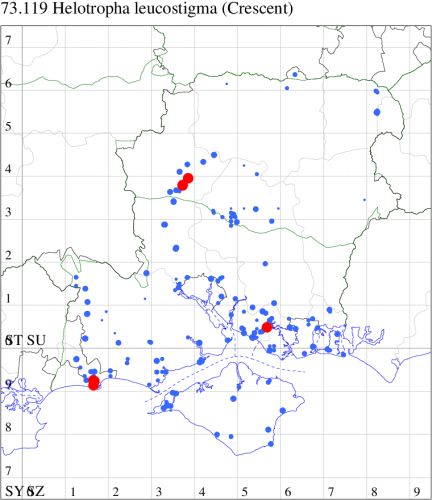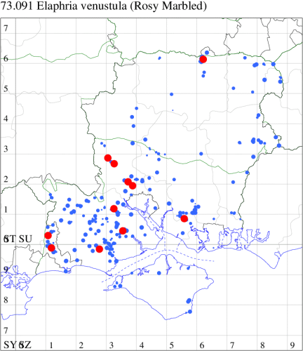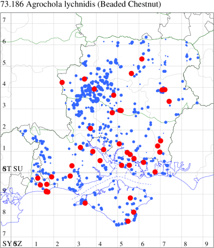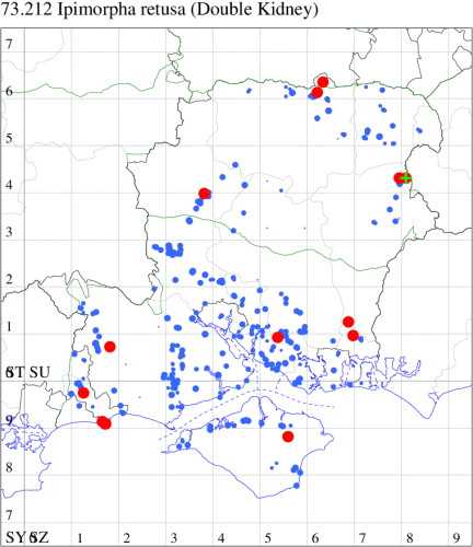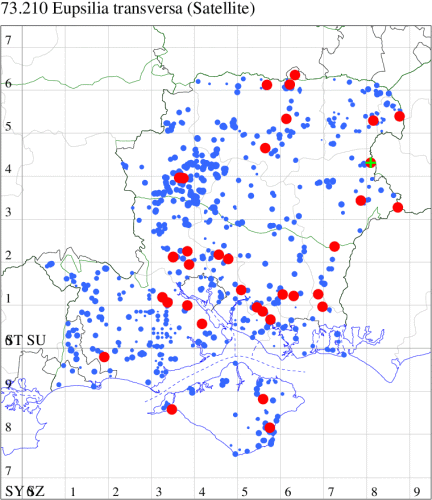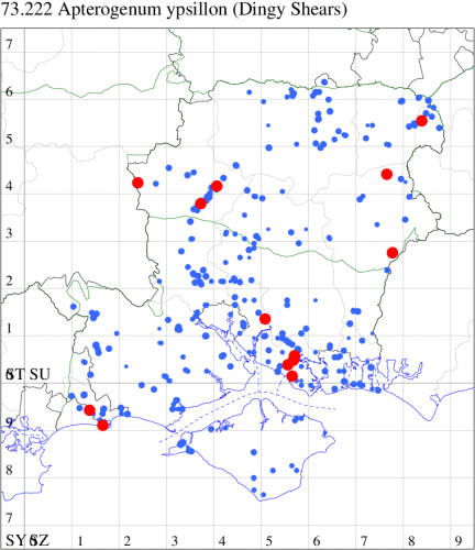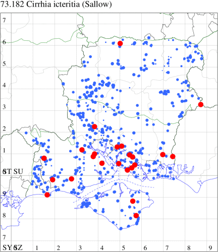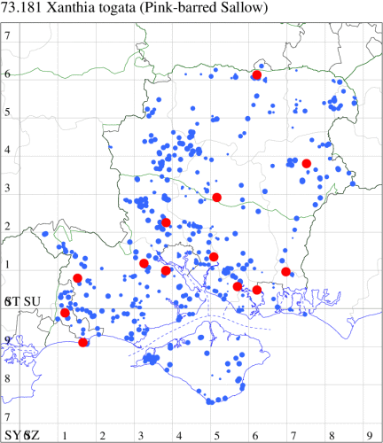 VC11: Marchwood, one, 19 Sep; one, 01 Sep; two, 06 Sep; one, 08 Sep (CTha); Woodlands, NF, one, 31 Aug (RBW); Lee, two, 06 Sep (CTha); Romsey, three, 01 Sep; five, 02 Sep; present, , 03 Sep (SRC); two, 30 Aug; three, 01 Sep; two, 03 Sep; one, 08 Sep; one, 16 Sep; one, 19 Sep (MJB); one, 01 Sep (NRJ); Stockbridge Down NT, one, 28 Aug (GCE); Dibden Purlieu, one, 28 Aug; Dibden Purlieu, NF, one, 01 Sep; one, 02 Sep; one, 07 Sep (RAC); Southampton, one, 19 Sep (MGP); West End, one, 01 Sep (AMD); Allbrook, two, 01 Sep; two, 02 Sep; one, 08 Sep; two, 20 Sep (SIng); Brownwich Cliffs, Titchfield, four, 06 Sep (F.M.G.); Funtley, four, 01 Sep (TDC); Fareham, one, 02 Sep; one, 08 Sep; one, 15 Sep (MLO); Botley, one, 01 Sep; one, 03 Sep; one, 13 Sep (SLB); Waterlooville, one, 08 Sep; seven, 06 Oct (DWhe); Northney, Hayling Island, present, 02 Sep; present, 13 Sep (JWP); Hurn, two, 11 Sep (MJef); Sway, one, 26 Aug; three, 01 Sep; one, 03 Sep; one, 08 Sep; two, 09 Sep (SKee); Sway, NF, present, 01 Sep (DMui);