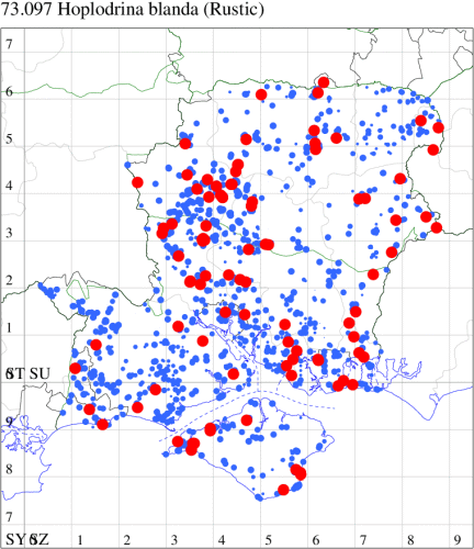 Common in a wide range of habitats, mainly in low-lying areas, including woodland, rough meadows and gardens throughout the British Isles, a species of conservation concern under the UK Biodiversity Action Plan. Common and well distributed in Hampshire and on the Isle of Wight. Wingspan 31-33 mm. Easily and frequently confused with Uncertain H. octogenaria, but generally H. blanda has a straighter costa, less rounded dorsum, smoother, more grey-brown forewing, stigmata less contrasting with remainder of forewing and slightly smaller. The Uncertain has broader wings, and is ochreous brown and coarser looking, with more obvious cross-lines, more contrasting stigmata, and a larger orbicular stigma. The Rustic has greyer and glossier in The Rustic, and appears later than The Uncertain, appearing towards the end of June, with the latter species appearing from late May. See the comparison photo in the collection above.