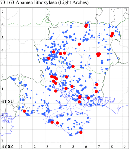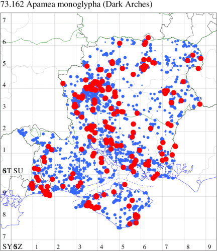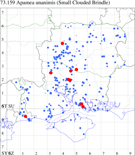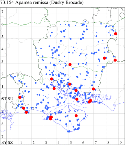 Following an expansion in range and numbers in recent decades, now common in grassland, heathland, woodland rides and gardens throughout southern England and Wales, north to southern Scotland. Widespread and common in Hampshire and on the Isle of Wight. Wingspan 27-34 mm. The main confusion species are Uncertain H. alsines and Rustic H. blanda, but less variable and often slightly smaller than these species, generally rather pale grey-brown, with relatively large orbicular and reniform stigmata, usually slightly darker than the ground colour, and usually distinctly white-edged. Larva feeds on various herbaceous plants, including Dandelion, Greater Plantain, Ribwort Plantain, Primrose and Prickly Lettuce.