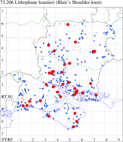 Local in damp woodland, marshes and fens throughout much of England and Wales. In Hampshire and on the Isle of Wight scattered through the three vice-counties, mainly along the river valleys. Wingspan 32-42 mm. Characterised by the pale, sinuous subterminal line, often edged basally by two or more moderately distinct, dark wedge-shaped spots (MBGBI Vol 10). Larva feeds on catkins and leaves of Eared Willow, Grey Willow, Goat Willow, Sallow, Black Poplar and White Poplar, over-wintering as an egg.