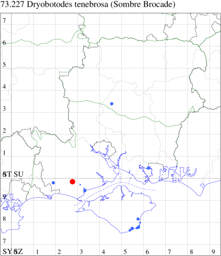 Very rare immigrant from southern Europe, appearing in Guernsey at Icart Point on 3 October 2006, since when it has become quite regular there. Recorded for the first time on mainland Britain at Durlston CP, Dorset, on 12 October 2008, with four at the same site between 29 September 2009 and 10 October 2009, suggesting that the species may be breeding locally. In Hampshire recorded for the first time at Sandy Point, Hayling, on 28 September 2010, the sixth British record, with two more records subsequently; on the Isle of Wight, it was first seen in 2012, and then underwent a remarkable transformation of status: after five in 2013, there have been multiple annual records, and it is almost certainly locally resident in the Bonchurch / Ventnor area. It may be locally established in Hayling Island / Portchester on the mainland: 2023 saw the first VC12 record with one way out of range in the Winchester area, which may have been a primary immigrant or dispersal from the coast. Wingspan 36-40 mm. Much darker and larger than Brindled Green D. eremita and appears very much later than Dark Brocade Blepharita adusta, from which distinguished by its generally smaller size, lack of white scaling in the reniform stigma, less angled forewing termen, and well-defined, curved postmedian line on the hindwing. Larva feeds on Evergreen Oak.