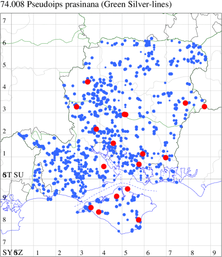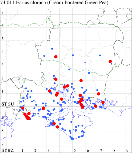 VC11: Marchwood, one, 19 May; one, 30 Jul (TDCh); one, 11 Aug; one, 11 Jul (CTha); Woodlands, NF, one, 24 Jun (RBW); Romsey, one, 16 Aug (MJB); Dibden Purlieu, NF, one, 03 Jun (RAC); Southampton, one, 25 Jun (MGP); Itchen Valley C.P., one, 19 Jul (F.M.G.); Stubbington, one, 22 Jun; three, 25 Jun; one, 28 Aug (DPH); Funtley, two, 25 Jun (TDC); Lee-on-Solent, one, 25 Jun; one, 26 Jun (IHrg); Fareham, one, 26 Jun (ADT); one, 25 Jun (IMcP); Dean, Bishop's Waltham, present, 10 Jun (CMor); Portsmouth, one, 26 Jun (IRT); Waterlooville, two, 02 Jun (DWhe); Northney, Hayling Island, present, 29 Aug (JWP); Merritown Heath, one, 29 Jun (DFoo); Christchurch: Cross Way, one, 26 Jun (LPyk); Christchurch, one, 30 Jul (APard); Hengistbury Head, one, 26 Jun (RPH det. MJef); Hengistbury Head NNR, one, 18 May (MJef); one, 24 Jun (RPH); one, 30 Jun; one, 01 Jul (BKin det. RPH); two, 07 Aug; one, 27 Aug (HengistH det. MJef); Hengistbury Head, two, 30 Jul (MJef); Burton, nr Christchurch, one, 18 Jun (JStw); Sway, one, 03 Jun; one, 22 Jun; one, 26 Jun (SKee); Sway, NF, one, 23 Jun (DMui); Browndown, two, 09 Aug (F.M.G.);