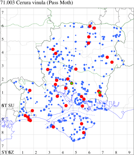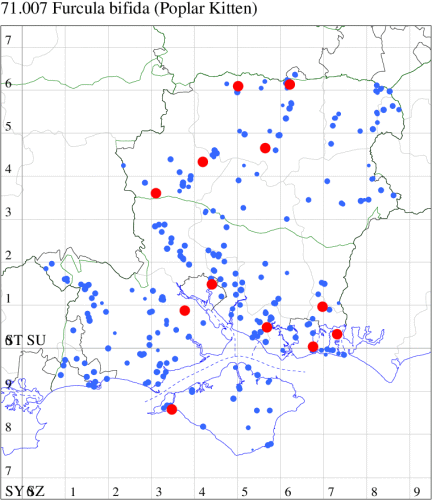 Common in gardens, hedgerows, open woodland, moorland and scrub, throughout the British Isles, but rare at high altitude. In Hampshire and on the Isle of Wight, widespread, but seen only in small numbers. Wingspan 62-80mm. Amongst resident species, unmistakable, although the very similar Feline Cerura erminea has been recorded twice on the Channel Islands. Larva feeds on Black Poplar, White Poplar, Aspen and Goat Willow, over-wintering as a pupa.