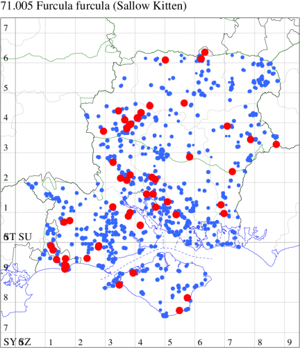 Common in woodland rides and clearings, hedgerows, parks, moorland, heathland and gardens throughout the British Isles. Widespread and common in Hampshire and on the Isle of Wight. Wingspan 35-42 mm. The main confusion species is Poplar Kitten F. bifida, but F. furcula is smaller and outer edge of central cross-band is usually rather irregular and usually only finely outlined in black in the leading half, while in F. bifida the outer margin of the median fascia is black and more evenly curved (MBGBI Vol 9). Larva feeds on Grey, Goat and White Willow, White and Black Poplar, and Aspen, over-wintering as a pupa.