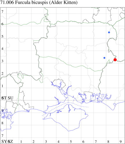 Local in woodland, thickets, copses and gardens, from Cornwall northwards through Wales and the west Midlands to south Lancashire, and in south-east England, Norfolk and Co. Durham. In Hampshire and Isle of Wight until 1945 there was only one record, at New Milton, the specimen of which was checked by Barry Goater. However 2022 saw the first for North Hampshire, at Woolmer, with a further five individuals in 2023 in the north of the county. Increased reports in Berkshire and Surrey indicate that this is a species that appears to be undertaking a welcome range expansion. Wingspan 40-48 mm. Compared with Sallow Kitten F. furcula and Poplar Kitten F. bifida, the central band is almost black (not grey), and distinctly pinched at its mid-point. Larva feeds on Alder, Silver Birch and Downy Birch, over-wintering as a pupa.