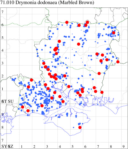 VC12: Earliest: Upper Inhams Copse, Pamber Forest, 11 Apr, 1 (GJD) Latest: Goodworth Clatford, 17 Aug, 1 (WLid, TJN, LFom) Max count: Middle Wallop, 29 Jul, 7 (TJN, RDon, GDon)
